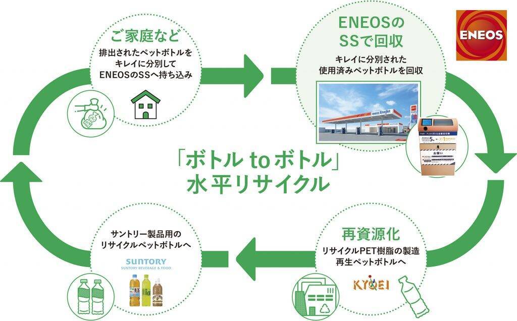 回収された使用済みペットボトルは協栄産業によって再資源化され、再びペットボトル容器として使用されるという。これにより「ボトルtoボトル」水平リサイクルが実現する。
