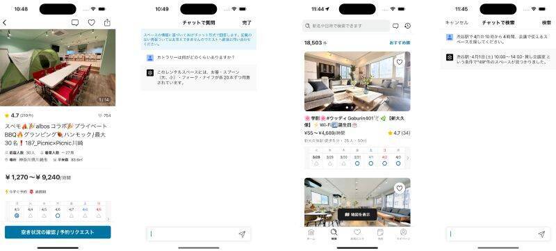 「チャット検索」イメージ全国のスペースを掲載するスペースマーケットは、これまでユーザーが求める条件に合致するスペースを簡単に検索するための様々な機能を提供している。