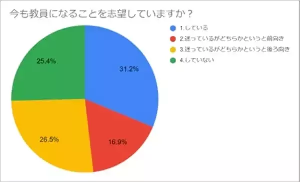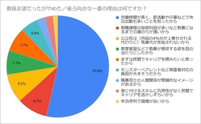 「今も教員になることを志望しているか」と尋ねたところ、25.4%が「していない」、26.5%が「迷っているがどちらかというと後ろ向き」で、合わせて51.9%が教員への志望度が下がっていることが分かった。今も教員になることを志望しているか教員志望をやめたり後ろ向きになった理由として、「労働時間が長く、部活動や行事などで休日出勤も多いことを知ったから」が最も多く、53.6%を占めた。