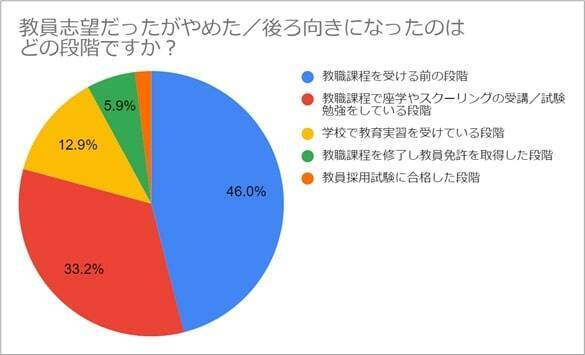 教員志望だったがやめた・後ろ向きになった段階については、46%が「教職課程を受ける前の段階」、33.2%が「教職課程で座学やスクリーニングの受講・試験勉強をしている段階」であり、教育実習前に8割の学生が労働環境などの情報収集をして後ろ向きになっていることが明らかに。