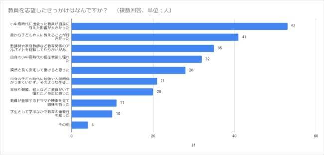 教員を志望するきっかけとしては、「小中高時代に出会った教員の影響」(53人)や「昔から子どもや人に教えることが好きだった」(41人)、「教育関係のアルバイトでやりがいを感じた」(35人)などの回答が上位に挙がった。