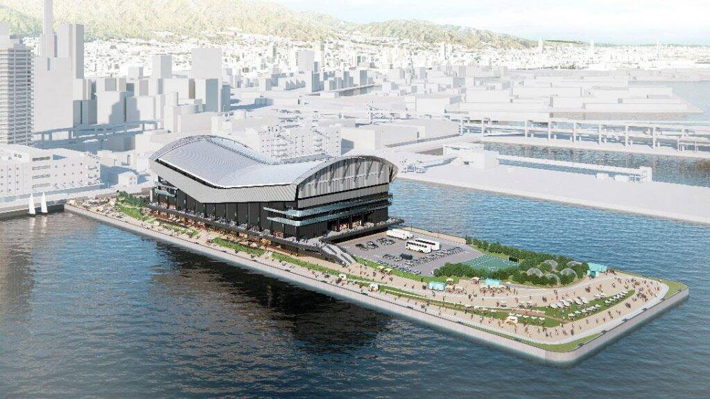 外観イメージ(南西から望む)同プロジェクトは、神戸市が公募した新港突堤西地区(第2突堤)再開発事業において、2021年に優先交渉権を獲得したNTT都市開発、スマートバリュー、NTTドコモの3社コンソーシアムによる民設民営のアリーナプロジェクト。