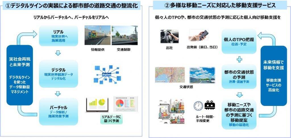 リアルな交通状態や大規模会員基盤の情報を基に、デジタルツインコンピューティングを用いてバーチャル世界に再現し、将来の交通状態を予測。バーチャル世界でのシミュレーションを通じて、都市高速道路を中心とした道路交通の整流化に適した施策を導出する。