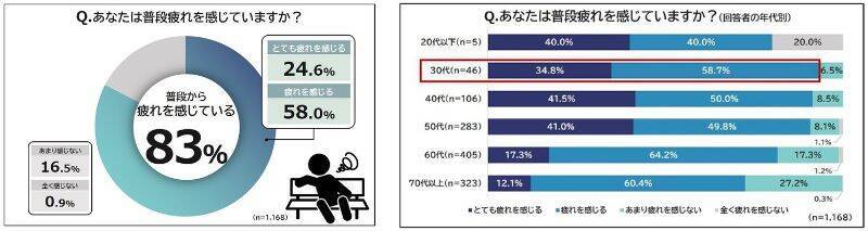 回答者の年代別では「疲れる」と回答した人が最も多かった年代は30代で、その割合は93.5%(とても疲れを感じる:34.8%、疲れを感じる:58.7%の合計)となった。
