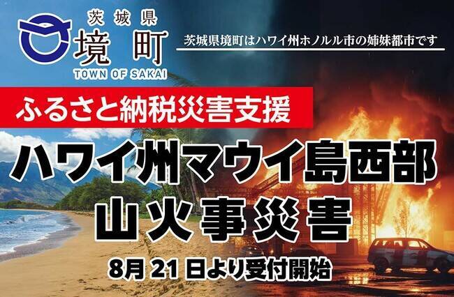 茨城県境町、ハワイ州マウイ島の災害支援へ集められた寄附金は、日本赤十字社への寄附金に充て、米国赤十字社による被災地での救援・復興支援活動およびマウイ島における救援・復旧活動を支援するとのことだ。