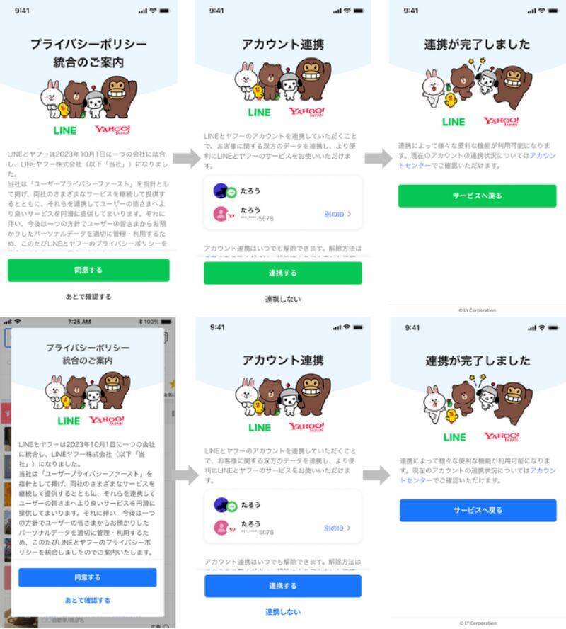 3. LINE、ヤフーそれぞれログイン済みの場合、アカウント連携画面が表示される。