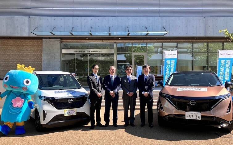 西宮市で災害を起因とする停電が発生した際、市が指定する避難所等でEVを電力源として活用するため、日産の販売会社の店舗に配備しているEVを無償貸与する。
