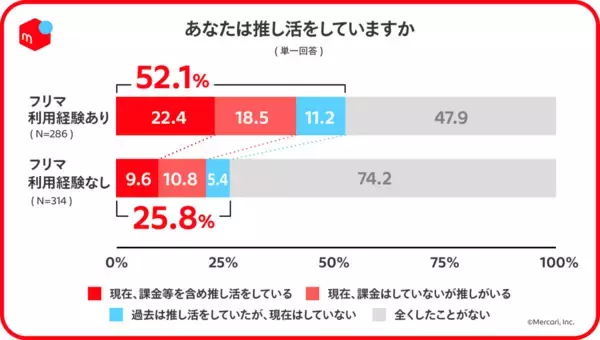 同調査で、推し活をしているかについて聞くと、している人・過去していた人の合算は、フリマサービス利用経験ありは52.1%、利用経験なしは25.8%で、大きな差があることが明らかになった。さらに、課金をしている人の割合も、フリマサービス利用経験ありは22.4%、利用経験なしは9.6%と2倍以上の差があり、フリマサービスと推し活の親和性の高さが伺えたとしている。