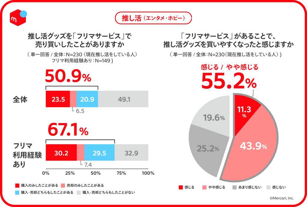 推し活を現在している・過去していたと回答した230人に、推し活グッズをフリマサービスで売り買いしたことがあるか聞くと、全体の約半数である50.9%、フリマサービス利用者で見てみると約7割の67.1%が、推し活グッズの売り買いを経験していることが明らかになった。さらに、フリマサービスがあることで推し活グッズを買いやすくなったと感じるかと聞いたところ、55.2%が「感じる」と回答。