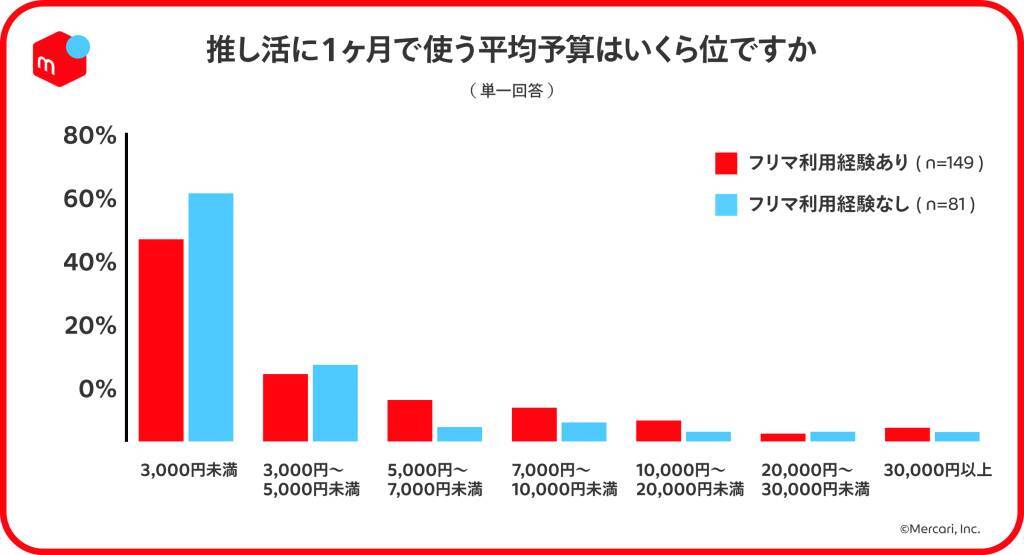 フリマサービスで推し活グッズを売り買いすることで、推し活全体の予算が「増えた」と回答した55人に、いくらくらいの予算が増えたかを聞くと、月平均予算が5,000円未満の人は2,000円(中央値、以下同)、5,000円以上10,000円未満は5,000円、10,000円以上は8,000円となり、一定の予算増額を後押ししていることが伺える。