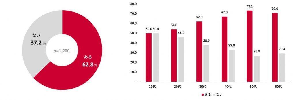 ネット通販での商品購入時に、配送ドライバーの負担を意識したことがあるかについて調査したところ、「ある」が回答が62.8%となった。また、年代の高い層ほど負担を意識する傾向にあり、40代以上では約7割が「ある」と回答している。