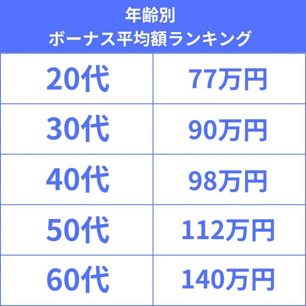 年齢別平均額年代別平均額は、20代が77万円、30代が90万円、40代が98万円、50代が112万円、60代が140万円となり、年代が上がるにつれて、ボーナスの金額も上がっていることが分かった。■勤続年数別平均額