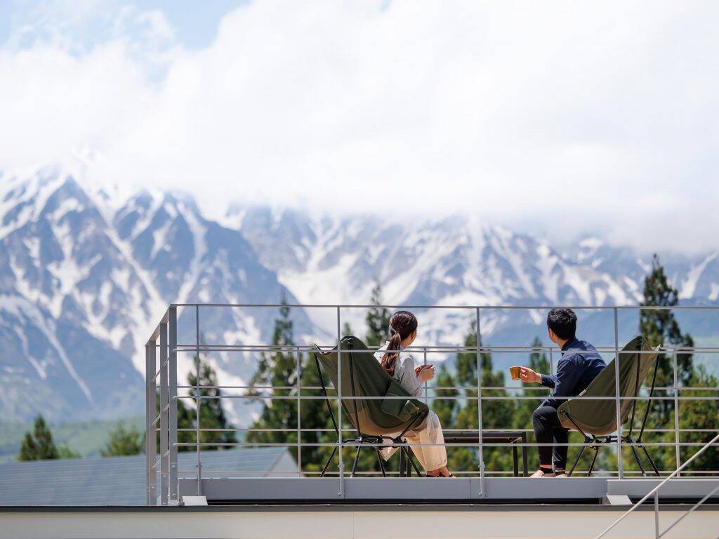 各棟にテラスと屋上デッキがあり、どの時間帯でも白馬三山の眺望を愉しむことができるという。