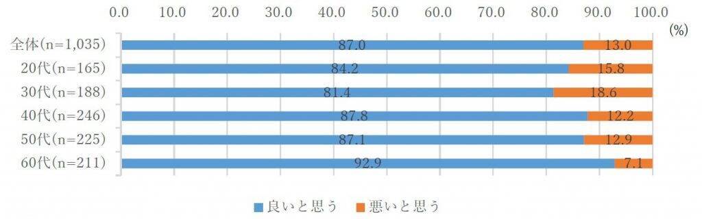 ■自身の飲食店でのふるまいが「良いと思う」87.0%、最も高いのは60代で92.9%