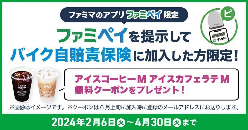 同キャンペーンでは、ファミマのアプリを提示して「バイク自賠責保険」に加入すると、アイスコーヒーM・アイスカフェラテMの無料クーポンを進呈するとのことだ。