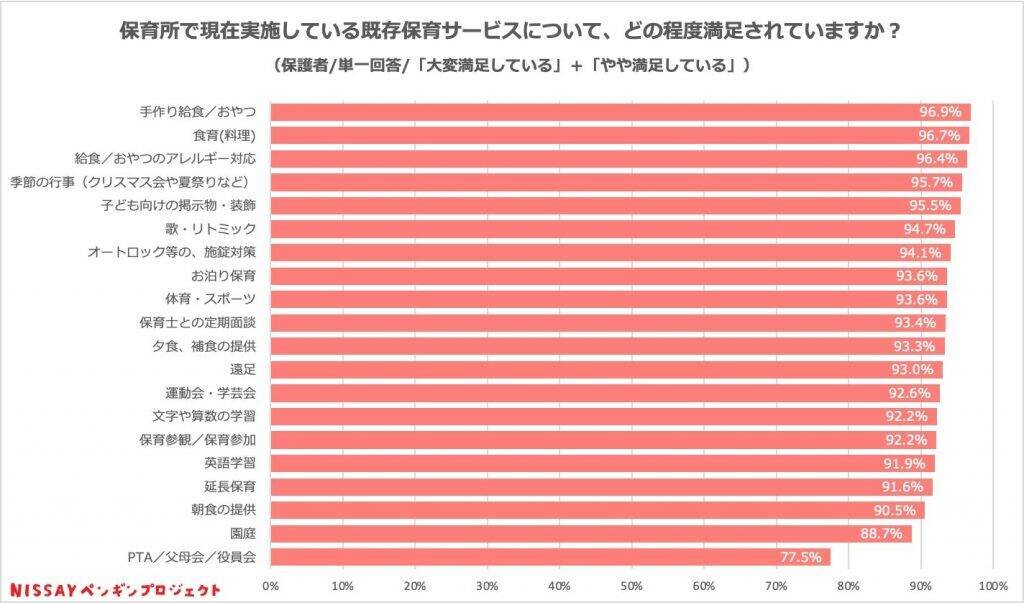 ・9割以上の保護者が、ほぼ全ての既存保育サービス・イベントに満足。現在実施されているほぼ全ての既存保育サービス・イベントにおいて、保護者の9割以上が満足と回答。