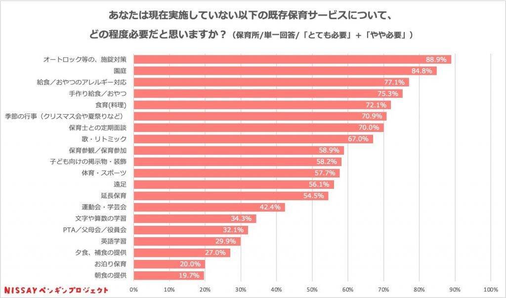 保育所側の調査で必要とする回答が最も多かったのは「オートロック等の、施錠対策」で88.9%となり、「園庭」が84.8%で続く結果に。