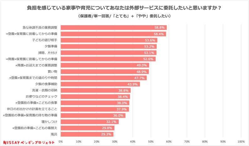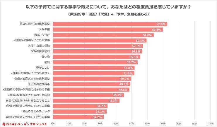 ・家事・育児の外部委託率は1%未満。子育てで負担に感じることについて、「急な体調不良の業務調整」が72.6%で最も多く、「夕飯準備」69.8%、「掃除、片付け」64.0%が続く結果に。