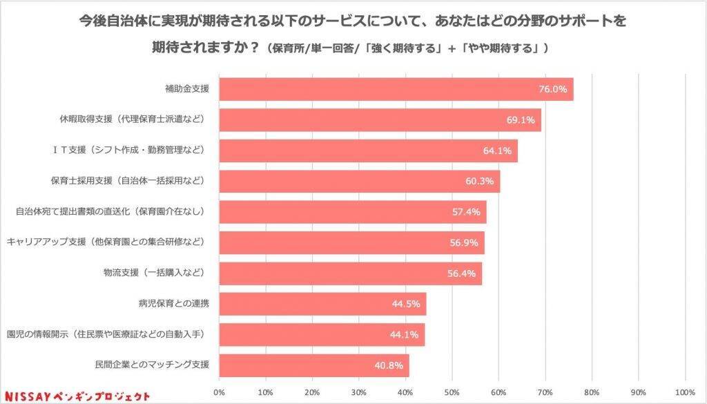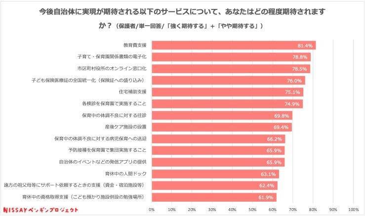 ・保護者、保育所双方が「金銭的な支援や日常的な利便性向上に関するサービス」を自治体に期待。自治体に期待する新規保育サービスとして、保護者側では「教育費支援」が81.4%で一番多い結果となった。その次に「子育て・保育所関係書類の電子化」、「市区町村役所のオンライン窓口化」が続く。
