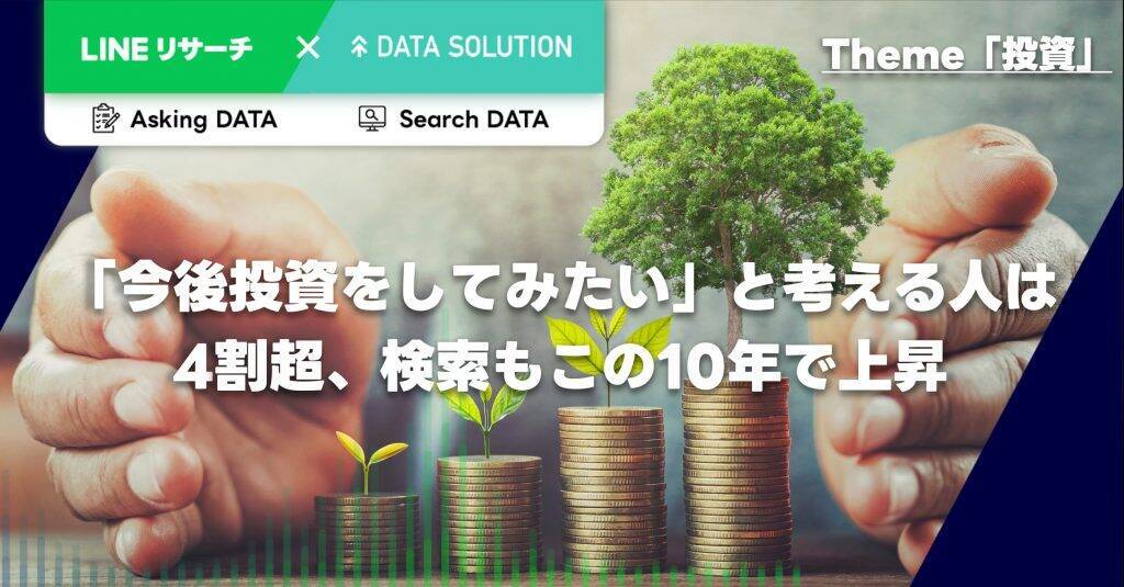 「ヤフー・データソリューション」は、過去10年間の検索ビッグデータを分析して投資への関心推移を調査。どの結果、全年代を通して投資・資産運用への関心は年々高まってきているものの、「LINEリサーチ」によるアンケートの投資意向に関する44%という結果に対して検索ユーザーは20%未満にとどまり、意向と実際の検索行動にギャップがうかがえる結果となった。