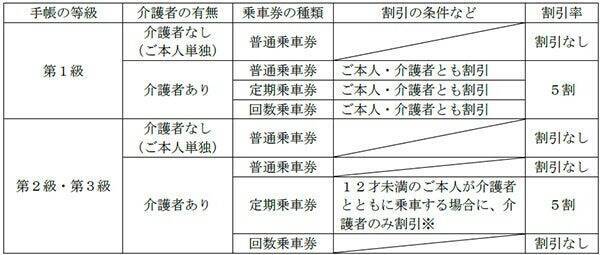 ・本人・介護者とも割引を受けることができるのは、同一の種類・乗車区間・有効期間の乗車券を同時に購入し、同一の列車に乗車する場合に限る。