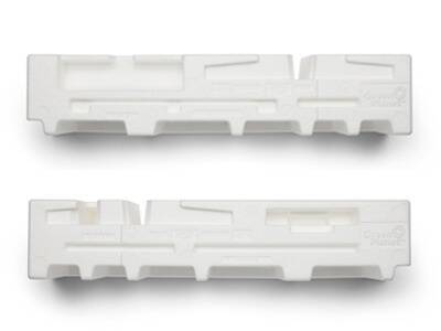 Green Planetを採用したBRAVIAの緩衝材緩衝材は、大型で重量のあるテレビの輸送時の耐衝撃性を確保するため、商品のデザインに合わせた複雑な形状に成型されているが、Green Planetの採用に向けては、発泡スチロールとは異なる素材の特性に合わせ、耐衝撃性を維持する設計と緩衝材の安定的な生産を両立する金型構造を実現したという。