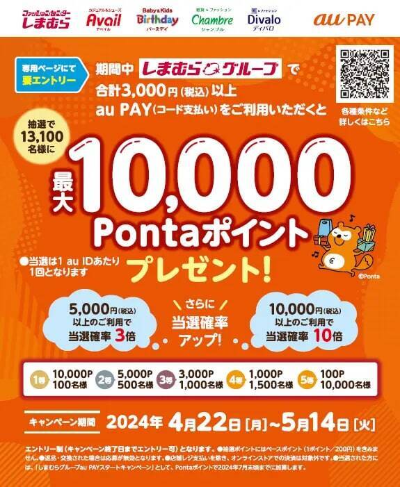 同キャンペーンでは、期間中、専用サイトでエントリーの上、しまむらグループ店舗で合計3,000円(税込)以上au PAYで購入した人の中から、抽選で13,100名に最大10,000Pontaポイントをプレゼントするという。