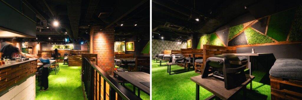 屋内型グランピングBBQレストラン内装店内は緑で彩られ、席数は74席で貸し切りにも対応しているという。