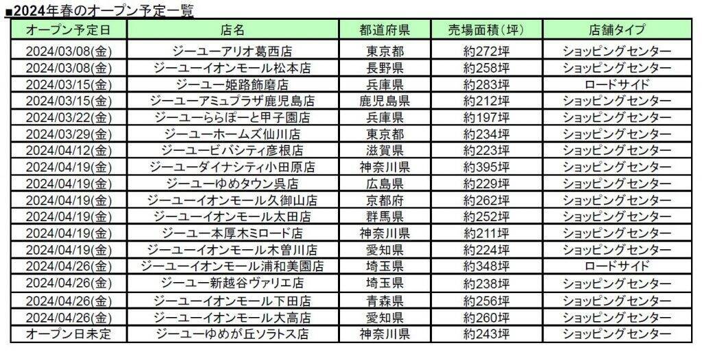 2024年春オープン予定店舗3月に東京・調布市にオープンした「ジーユー ホームズ仙川店」、4月に広島・呉市にオープンした「ジーユー ゆめタウン呉店」はそれぞれ市内初出店。