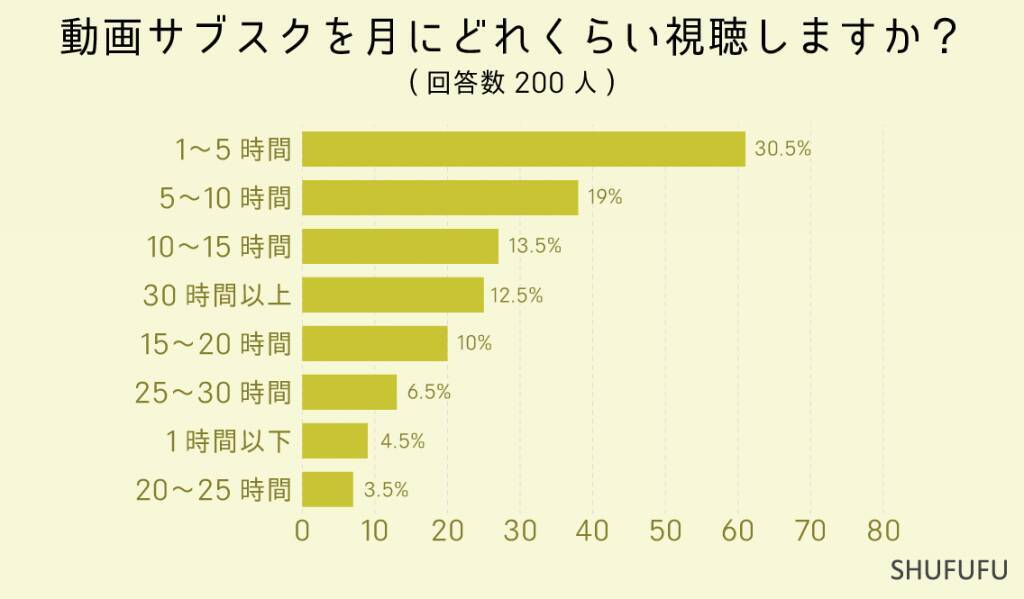 同調査で、動画配信サブスクを月にどれくらい視聴するか聞いたところ、最も多かったのは「1~5時間」で30.5%という結果に。次いで「5~10時間」が19%、「10~15時間」13.5%と続いた。動画配信サブスクを月にどれくらい視聴するか