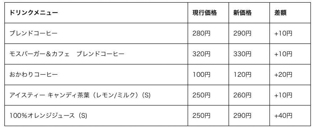 モスフードサービスでは、これまで価格の維持に努めてきたが、内部努力だけでは賄いきれない状況となり、特に影響が顕著なコーヒー、紅茶、オレンジジュースに限って販売価格変更を決定したという。