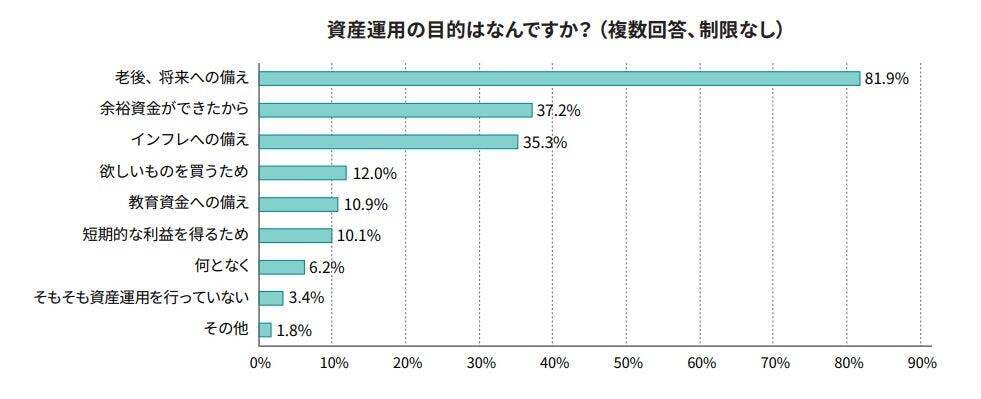 ■資産運用の目的は「老後、将来への備え」と回答した人が最も多く82%。資産運用を行っていない人は3%にとどまる。