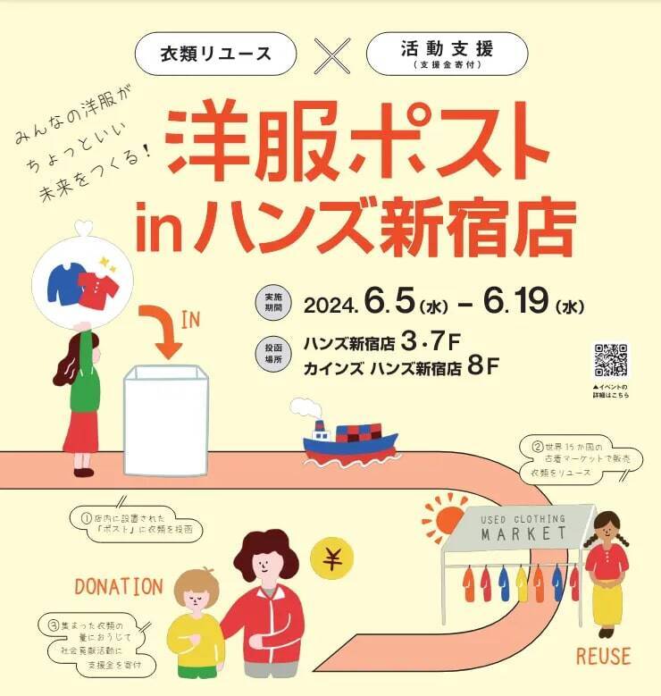 ハンズ新宿店で服のリユース活動「洋服ポスト」を6月5日より実施「洋服ポスト」とは、NPO法人洋服ポストネットワーク協議会が主体となって運営する、眠っている洋服を寄付して環境保全や社会貢献につなげる取り組み。