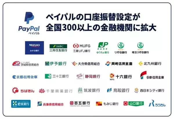 ペイパルの口座振替設定が全国の地方銀行を含む300以上の金融機関に拡大ペイパルの口座振替設定は、これまで大手金融機関(みずほ銀行、三井住友銀行、三菱UFJ銀行、ゆうちょ銀行、りそな銀行、埼玉りそな銀行)のみ対応していたが、日本電子決済推進機構が運営する「Bank Pay」との接続により、今回新たに全国の300以上の金融機関の銀行口座を登録できるようになった。