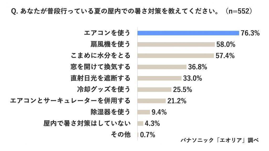 夏の屋内での暑さ対策は、「エアコンを使う」が最多の76.3%。夏の屋内での暑さ対策さらに、気象変化とともにエアコンの使い方も変化しているとし、最近では1日の使用時間が長く、夏の期間24時間連続の「つけっぱなし運転」をしている人が増加傾向にあるという。