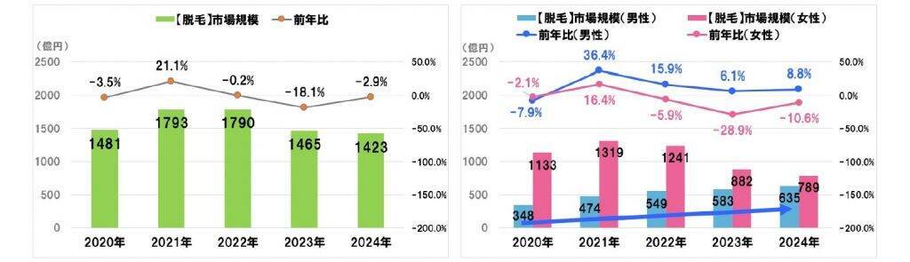 美容センサスから推計した市場規模は、1423億円(前年比2.9%減)で、男性の市場規模が右肩上がりに拡大(635億円、前年比8.8%増)。市場規模推計