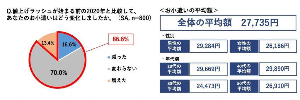 調査の結果、値上げラッシュが始まる前の2020年と比較して、8割以上がお小遣いが増えていないことが判明。増えていない人のうち「変わらない」人は70.0%、「減った」人は16.6%という結果に。また、お小遣いの平均額は27,735円となり、約半年前に実施した前回のお小遣い調査と比較すると、18円増加(+0.06%)とほぼ変動しなかった。