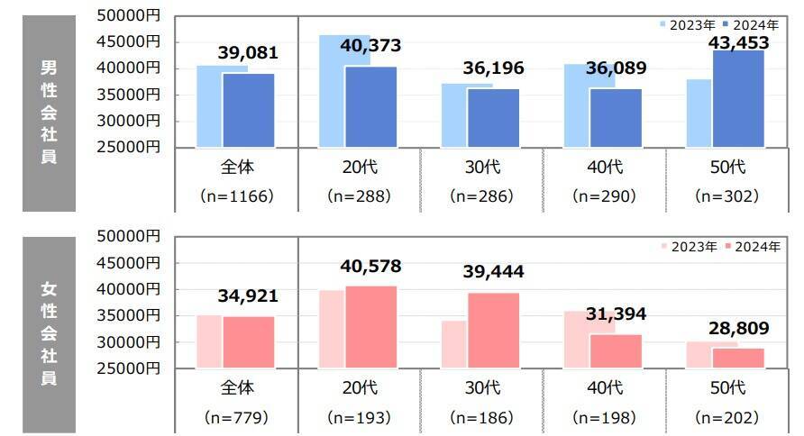 ■【お小遣い額(毎月の平均額)】男性会社員は前年比減で39,081円になり、女性会社員も前年比減で34,921円