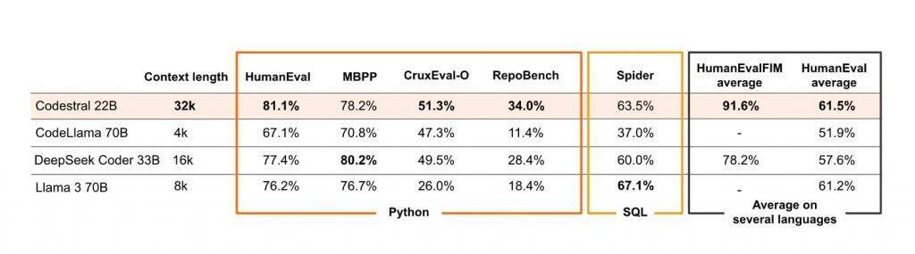 特筆すべきは、HumanEvalにおける成績だ。Codestralは、このベンチマークテストにおいて81.1%のスコアを達成、GPT-4オリジナル版が記録した67%を大きく上回るパフォーマンスを示したのだ。