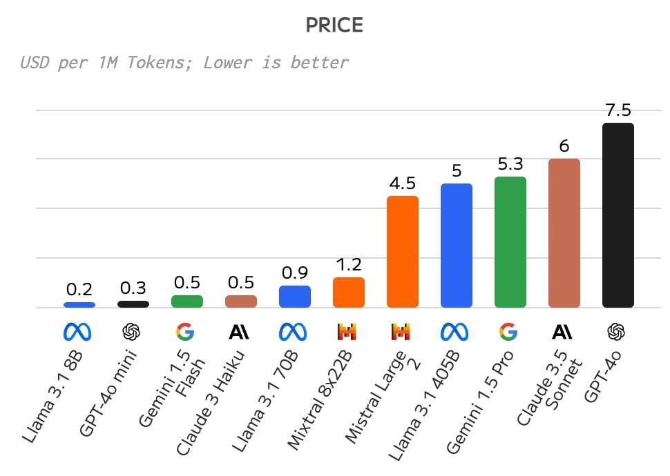 AIの世界では、モデルのサイズ(パラメータ数)が大きければ、性能も高くなる傾向があるため、巨大なモデルを開発しようという動きが目立っていた。しかし、開発と運用にかかる莫大なコストが問題視され、より小型で効率的なモデルを求める声が高まっている。たとえば、OpenAIのフラッグシップモデルGPT-4のパラメータ数は、1兆以上あると推定されており、運用するために日々膨大な計算処理コストが発生、それがエンドユーザーの(API)コストに転嫁されているのだ。主要大規模言語モデルのAPIコスト、GPT-4oのコストが最も高い(ArtificialAnalysisより)