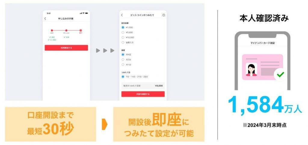 特徴1:最短30秒の口座開設後、即座につみたて設定が可能本人確認済みの利用者は、最短30秒で申し込みが完了し、すぐにビットコインのつみたて設定が可能。