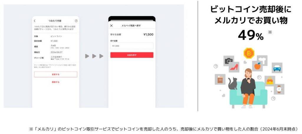 つみたて設定はいつでも自由に見直し・解除が可能。またつみたてたビットコインは、いつでもすぐにメルペイ残高に戻して、「メルカリ」での買い物や「メルペイ」「メルカード」の支払いに利用することができる。
