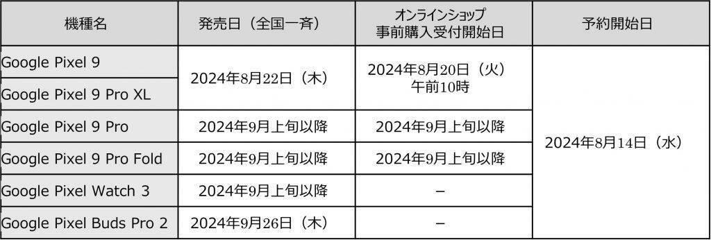また、「Google Pixel 9 Pro」、折りたたみスマートフォン「Google Pixel 9 Pro Fold」およびワンナンバーサービス(R)に対応したスマートウォッチ「Google Pixel Watch 3」は9月上旬以降に、GoogleのAI搭載イヤホン「Google Pixel Buds Pro 2」は9月26日に発売するとのことだ。