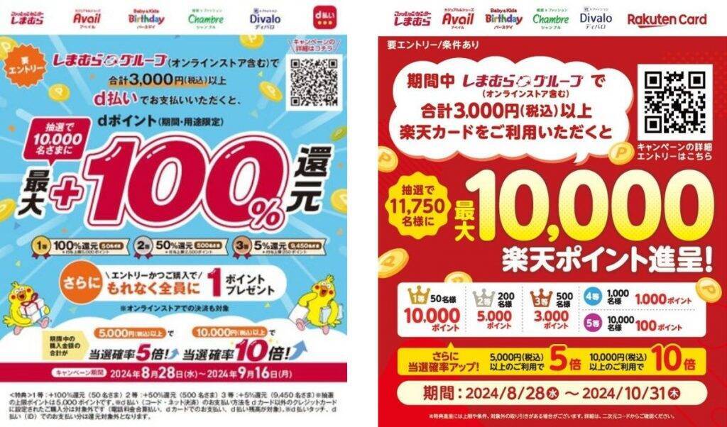 しまむら、「d払い」「楽天カード」利用でポイント還元キャンペーン開催キャンペーン期間中、専用サイトでエントリーして、しまむらグループの店舗・オンラインストアで合計3,000円以上(税込)d払いで買い物をした人の中から、抽選で10,000名に最大100%(最大5,000dポイント)をdポイントで還元。