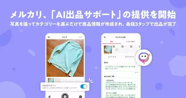 メルカリ、「AI出品サポート」提供開始AI出品サポートでは、出品時に商品の写真を撮影またはアップロードし、カテゴリーを選択するだけで、商品説明、商品の状態、販売価格といった必要な情報が自動で入力されるという。