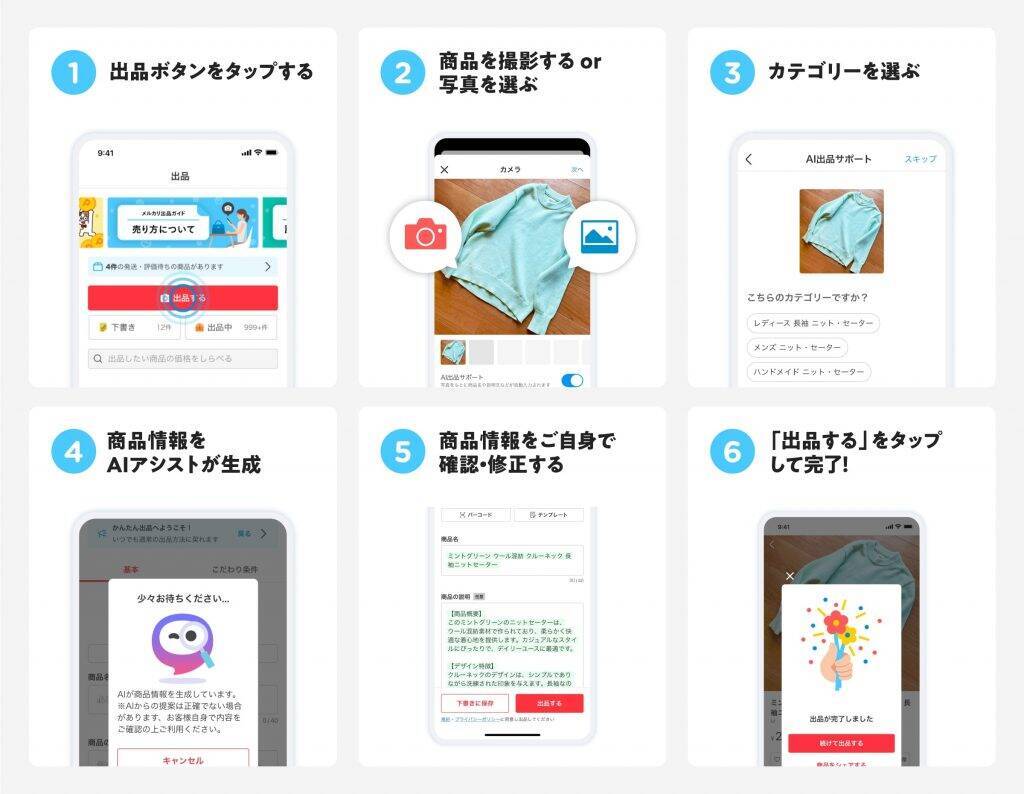 具体的な利用方法は、まずアプリのホーム画面から「出品する」ボタンをタップし、商品を撮影するか写真を選ぶ。次にカテゴリーを選択し、AIが生成したタイトルや商品説明文、商品の状態や価格を確認、必要に応じて修正することができる。その後、「出品する」ボタンをタップすれば出品が完了するとのことだ。
