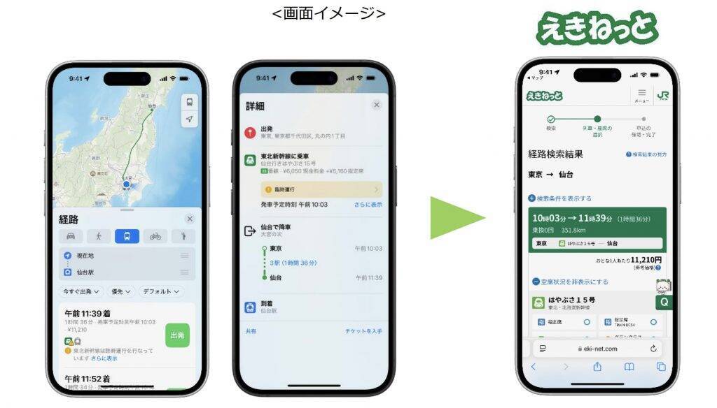 画面イメージ対応エリアはJR東日本エリア内完結のルートおよび北海道新幹線の新青森駅~新函館北斗駅間で、きっぷの申込可能時間は5時00分から翌日1時50分まで(23時50分~翌日0時10分は除く)。なお、Appleマップで2週間以内の乗車日で検索した場合に限り「えきねっと」へのリンクが表示される仕様であるという。