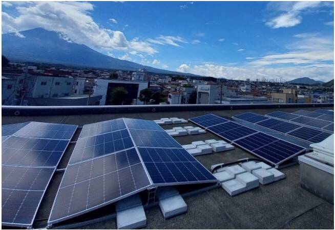 山梨中央銀行吉田支店 建物屋上に設置した太陽光パネル民間企業の店舗敷地内における、ドコモEMSを活用したオンサイトPPA方式の実証実験はドコモ初となるという。