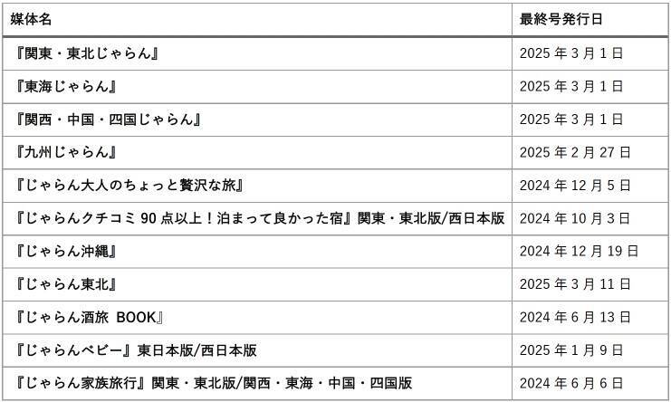 昨今のユーザー動向を含む社会の変化を受け止め、隔月誌「関東・東北じゃらん」「東海じゃらん」「関西・中国・四国じゃらん」「九州じゃらん」・臨時増刊号およびじゃらんムックシリーズは2025年3月発行をもって休刊するという。