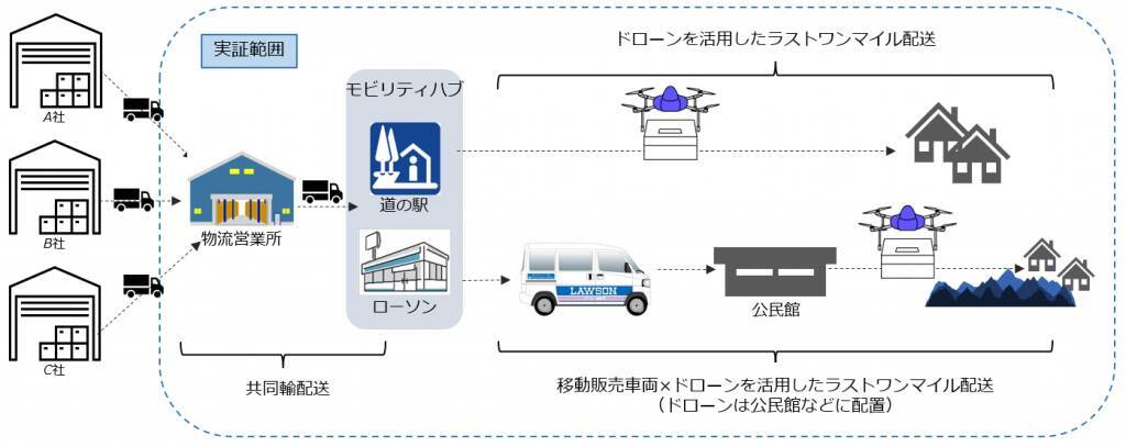 同実証では、2025年1月以降(予定)に秩父市において、物流営業所から配送される荷物をローソン店舗や道の駅などの中継拠点(以下、モビリティハブ)に一時集約。